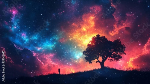 © Sandu, Fototapeta premium Person Stands Under Tree Against Stunning Cosmic Night Sky