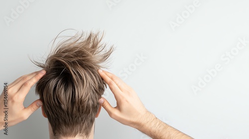Fototapeta premium Person styling messy hair, hands on head, modern lifestyle concept.