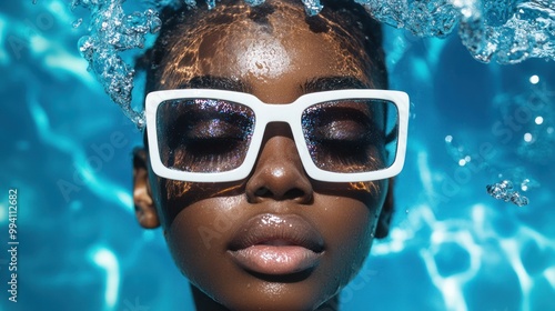 © GoodandEvil, Fototapeta premium Person swimming underwater with white goggles focused closely