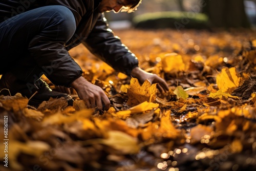 © Anastasiia, Fototapeta premium Person Tending To Fallen Leaves In Autumn. Сoncept Autumn Leaf Cleanup, Raking Leaves, Fall Yard Work, Nature's Carpet, Seasonal Chores