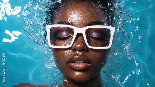 © GoodandEvil, Fototapeta premium Person underwater with splashes and white goggles on