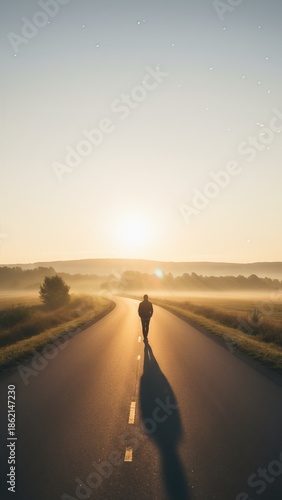 Fototapeta premium Person Walking Alone On Empty Road At Sunrise New Beginning Concept