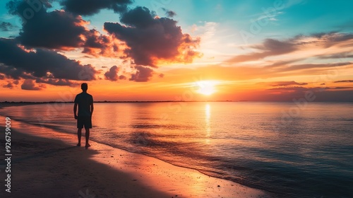 © Mehak, Fototapeta premium person walking along beach at sunset