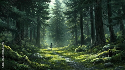 © Ibnu, Obraz premium Person walking forest path, mossy, sunlit.
