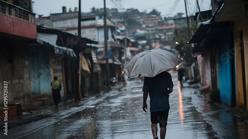 Obraz premium Person Walking in Rainy Street Holding an Umbrella in a Somber Mood :...