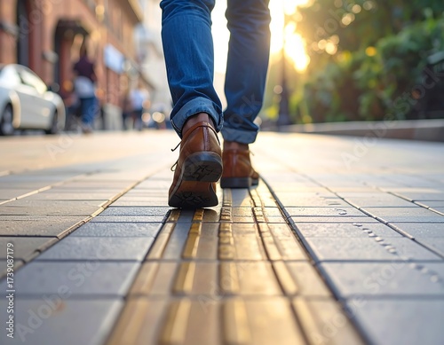 Fototapeta premium Person walking on a sidewalk in an urban environment with sunlight