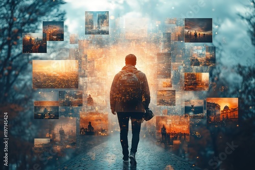 Fototapeta premium Person walking towards a city skyline composed of overlapping images.