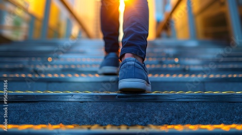 Fototapeta premium Person Walking Up Stairs in Sunset Light