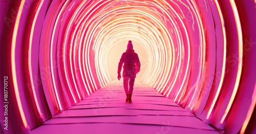 Fototapeta premium Person walks toward bright tunnel. Neon lights create circular patterns,...
