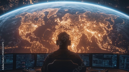 © Tetiana, Obraz premium Person watches glowing world map from control room with many screens. Concept: Awareness cybersecurity, global network security