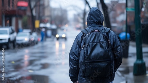 Fototapeta premium Person wearing a black rain jacket and backpack walking on a rainy city...