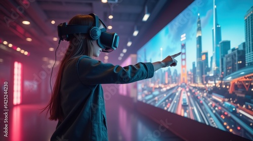 Fototapeta premium Person wearing a VR headset, reaching out to interact with floating 3D...
