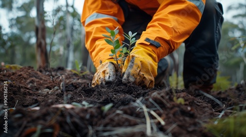 © Nicolas Swimmer, Fototapeta premium person wearing an orange jacket is actively digging in the dirt planting native trees