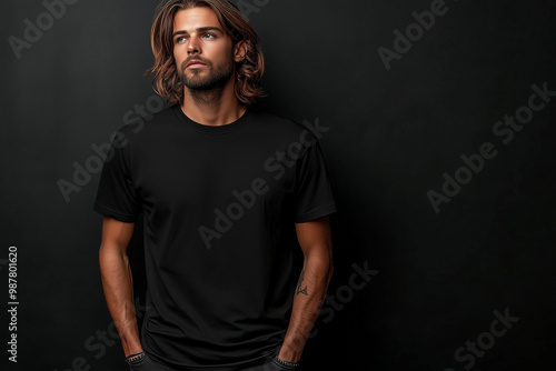 © Anhelina, Obraz premium Person Wearing Black T-Shirt Mockup, men model