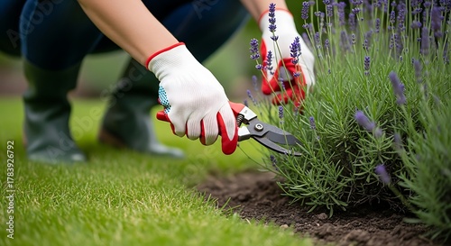 © ImageHome, Fototapeta premium Person wearing gardening gloves pruning lavender with shears plant