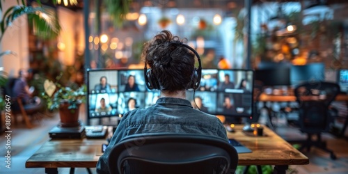 © Iryna, Naklejka premium Person wearing headphones, attending a virtual meeting on multiple screens in a modern, cozy office with plants and warm lighting