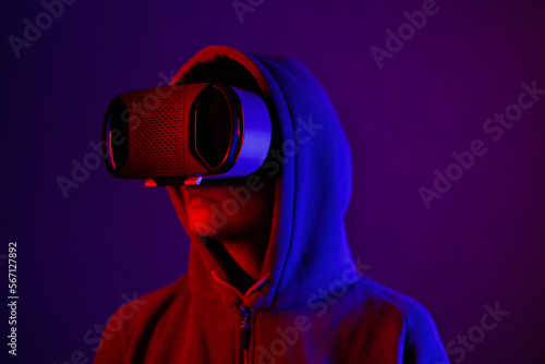 © MyJuly, Obraz premium person wearing virtual reality glasses gets experience of gaming and entertainment. people in VR touches space with hands, blue and red light of abstract lamps. modern technologies of future