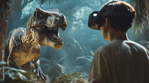 © avaye, Naklejka premium Person wearing VR headset facing a realistic dinosaur in a jungle setting, blending virtual reality with prehistoric adventure and excitement