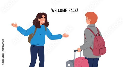 Fototapeta premium Person Welcoming Traveler Arriving with Suitcase and Backpack