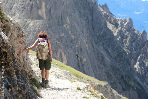 Obraz premium person with backpack during a summer hiking in the Dolomites