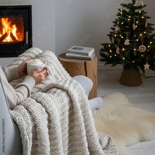 Obraz premium Person with Drink in Chair by Fireplace and Christmas Tree