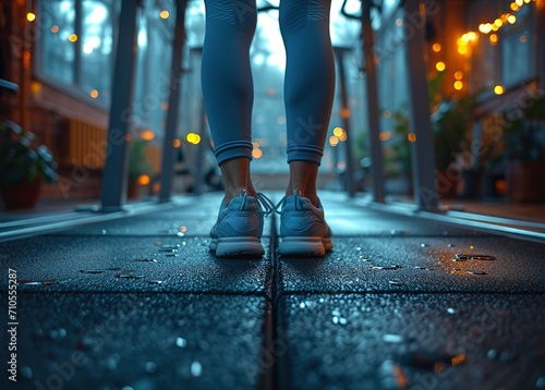 Fototapeta premium person with text start 2020 on machine in gym, rug, endurance art, jump cuts, simple and elegant style, high-angle