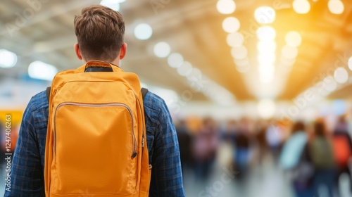© WORLDSTOCK, Naklejka premium Person with Yellow Backpack Facing Crowd at Indoor Event or Fair Scene with Lights