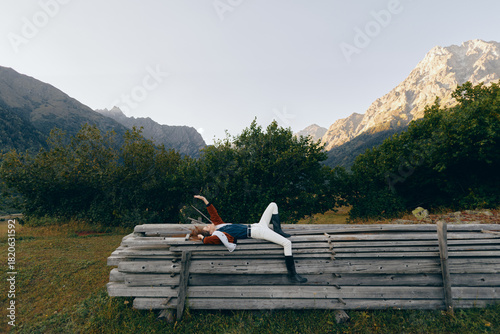 © SHOTPRIME STUDIO, Fototapeta premium Person woman lying on stacked logs in a meadow, enjoying nature and mountains view, relax outdoors among trees and wooden pile for peaceful countryside rest and leisure.