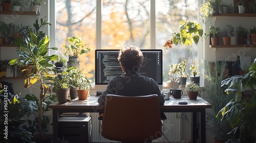 © Eidoran, Fototapeta premium Person working from home with plants in the background