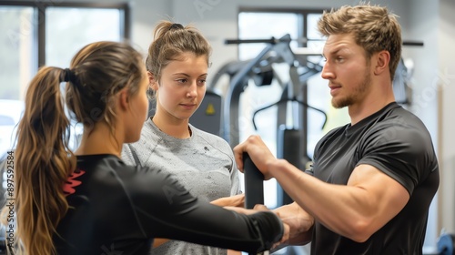Obraz premium Personal trainer helping two women with their workout routine at the gym.