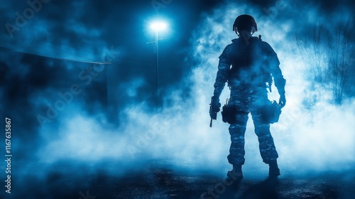 © AmStock, Fototapeta premium Personnel in Uniform Against Dim Industrial Background