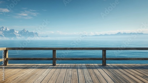 © S, Fototapeta premium Perspective from a wooden viewing deck with no railings, looking out over a boundless ocean