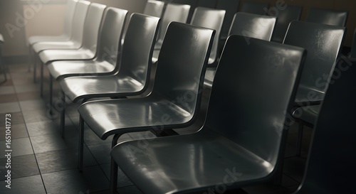 Fototapeta premium Perspective of empty chairs in line, concept of waiting and patience