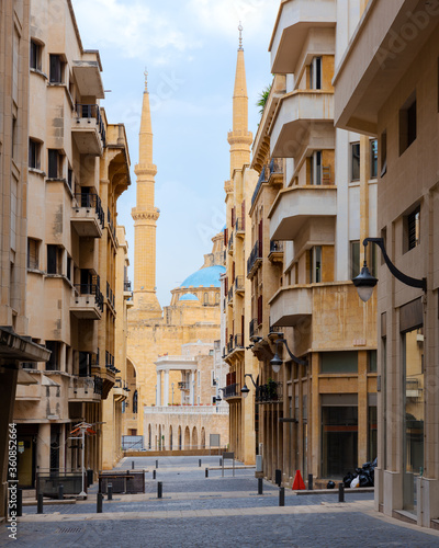 © Em Campos, Obraz premium Perspective of newly rebuilt Nejmeh square area in Beirut Downtown city center and Al Amine blue mosque, Lebanon