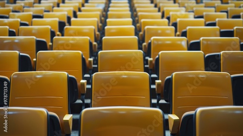 Fototapeta premium Perspective Symmetry Vibrant Yellow Stadium Seats with Deep Blue Backs,...