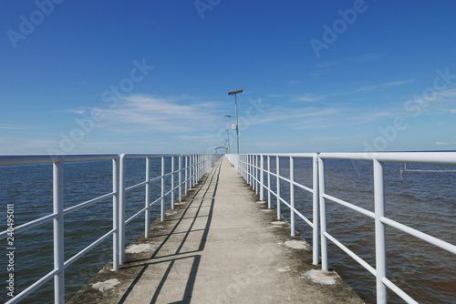 © MohamadFaizal, Obraz premium Perspective view of jetty with LED street light with solar cell on clear blue sky.
