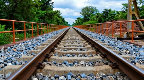 Naklejka premium Perspective view of railway tracks leading through lush greenery with a...