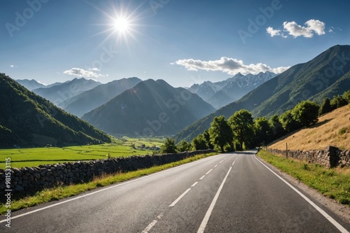 © ThomasLENNE, Naklejka premium Perspective view of rural road among range of mountains in bright sunlight.