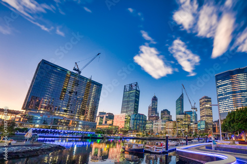 © jovannig, Obraz premium Perth, Australia - August 31, 2023: Bridge and skyscrapers of Elizabeth Quay at sunset, Perth