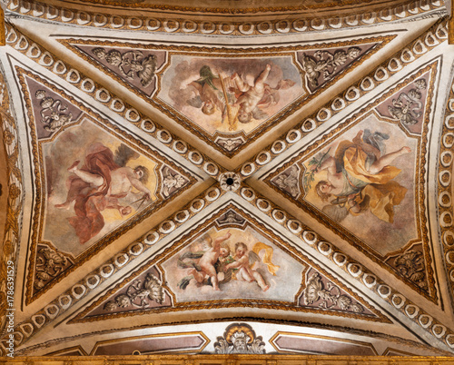 Fototapeta premium Perugia - The ceiling fresco of angels with the symbolic instruments in the...