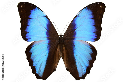 © Roman, Obraz premium Peruvian blue Morpho butterfly (Morpho deidamia, male, upside) isolated on white background