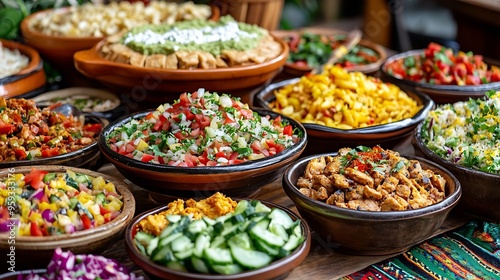 Fototapeta premium Peruvian food buffet table Assorted dishes gourmet cuisine Peru traditional :...