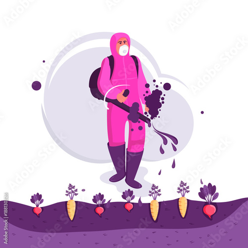 © Shi , Obraz premium Pest control. Farmer spraying pesticides on field.