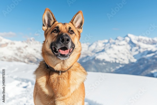 Naklejka premium Pet in snowy mountain landscape concept. A happy dog stands in a snowy landscape, with mountains in the background, showcasing a bright blue sky
