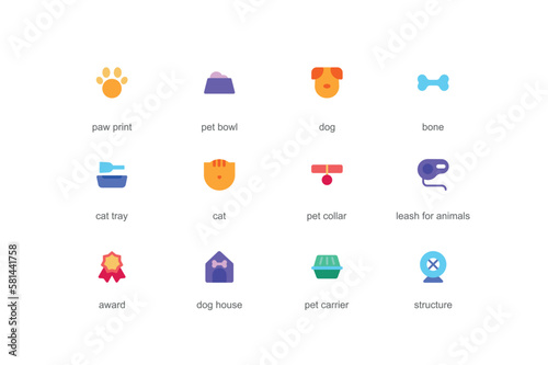 © DesignSells, Naklejka premium Pet items concept of web icons set in color flat design. Pack of paw print, food bowl, dog, bone, cat tray, collar, leash for animal, award, house, carrier and other. Vector pictograms for mobile app