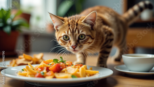 © cyishu, Fototapeta premium Pet mischief concept ,curious domestic cat jumping onto wooden dining table, sniffing freshly prepared meal with innocent wide eyes and perked whiskers,natural sunlight illuminating fluffy fur.