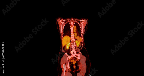 © samunella, Obraz premium PET scan image displaying whole-body metabolic activity in a side profile view. Suitable for medical education, diagnostics, and research in cellular function.