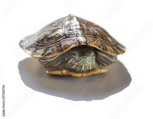 © Freer, Obraz premium pet turtle red-eared slider or Trachemys scripta elegans hides its head under the shell