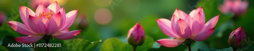 © Sarayuth, Fototapeta premium Petals unfolding in soft pink hue amidst lush green foliage, blossom, greenery, bloom