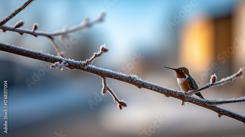 © Studio Zenith, Obraz premium Petit colibri coloré perché sur une branche givrée en hiver